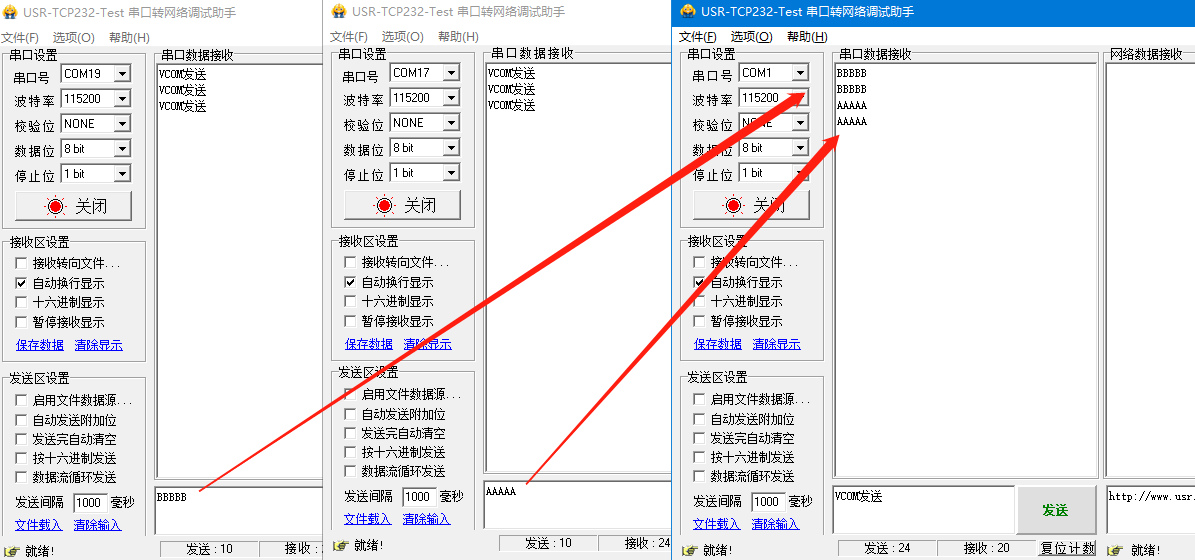 26、打開三個串口調試助手進行數據通信測試,測試結果如下。其中模塊與電腦通過串口線直連所識別出來的串口號可以在設備管理器中查看。