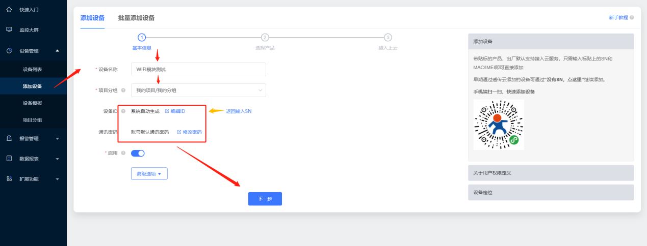 9、再次添加設備,名稱設置“wifi透傳組測試模塊”,設備ID與通信密碼自動生成后點擊“下一步”后,選擇“數據透傳”,確認添加。