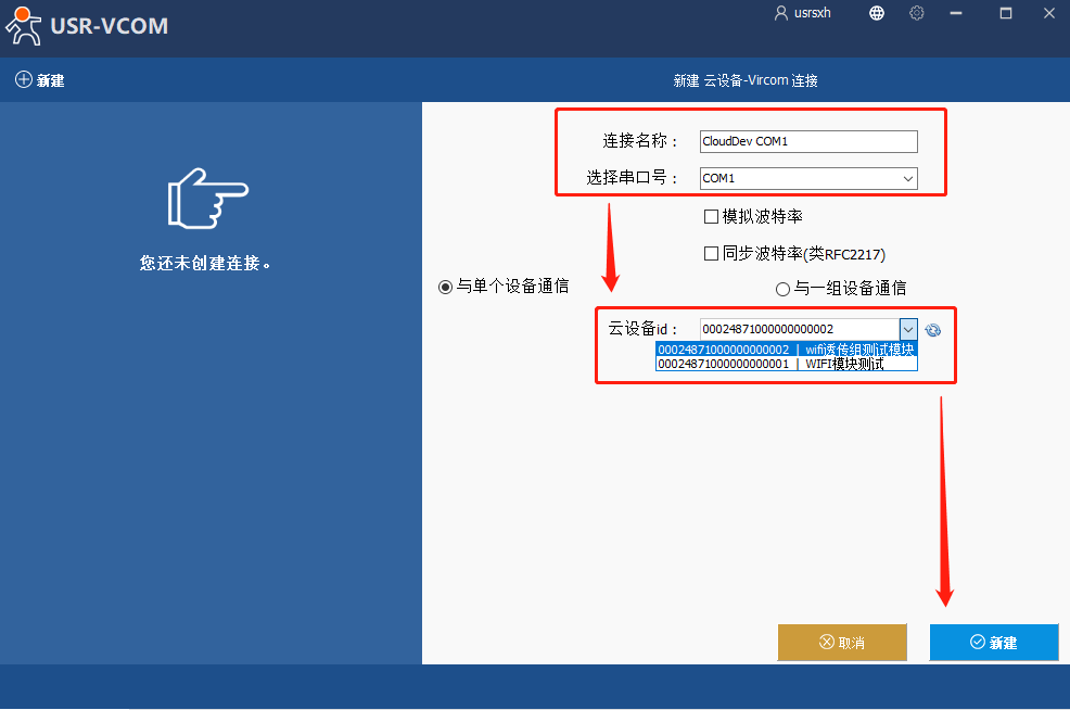 19、選擇一個沒有使用串口號,選擇云端剛才添加的設備,點新建,生成設備對應的虛擬串口。