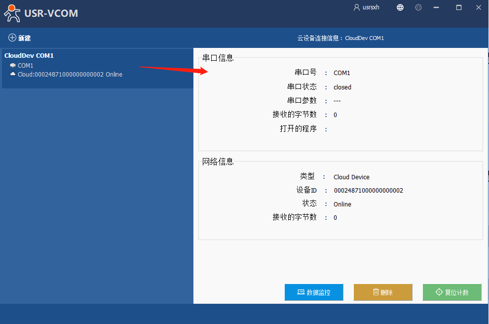 17、選擇一個沒有使用串口號,選擇云端剛才添加的設備,點新建,生成設備對應的虛擬串口。