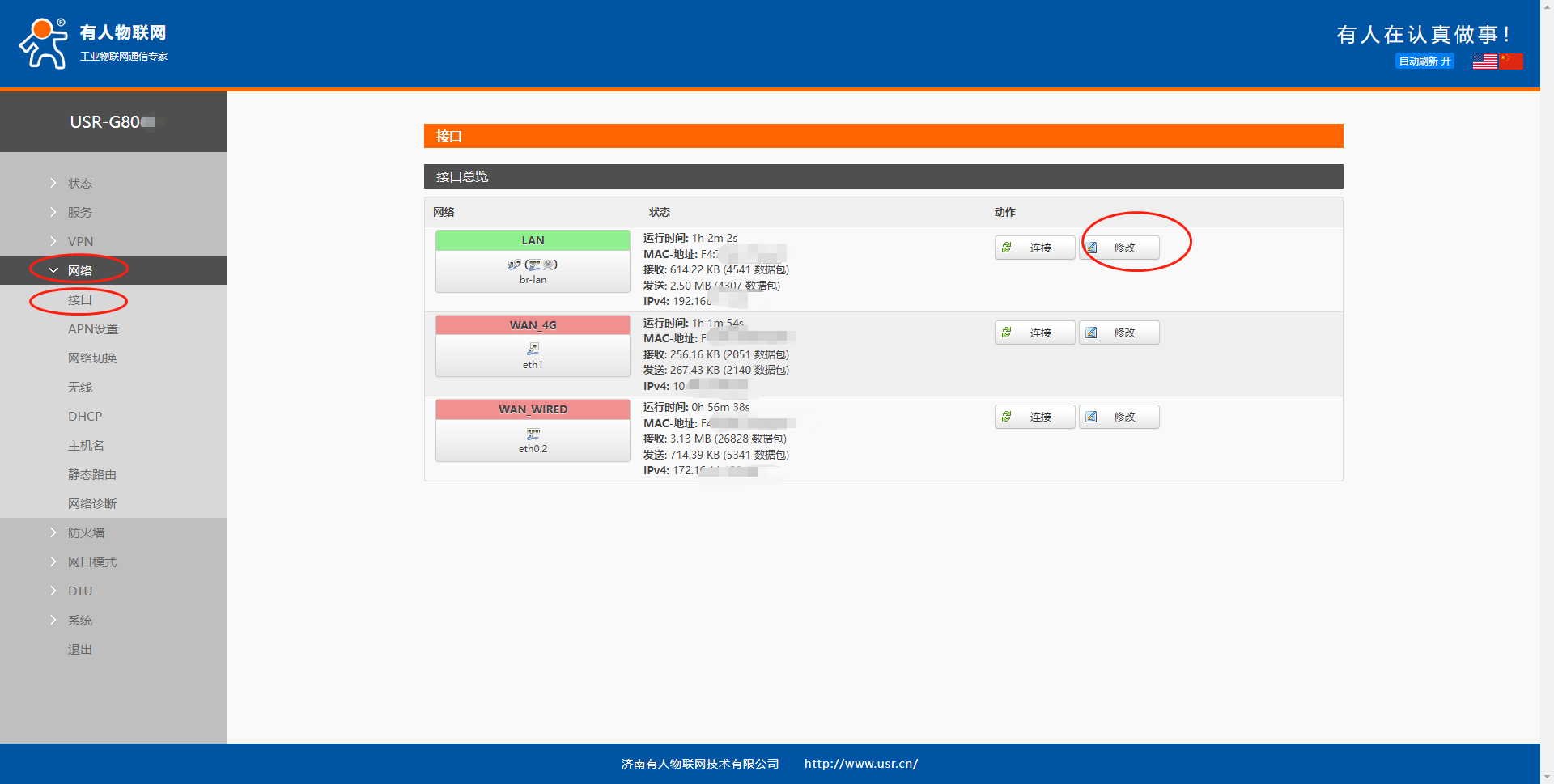 G80x(包括G806、G806s等以及G810)系列:網絡--接口--修改--IPV4地址--保存&應用