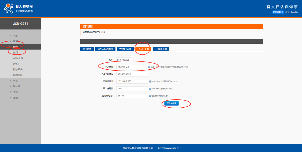 G781:網絡--接口--LAN口設置--IPV4地址--保存&應用