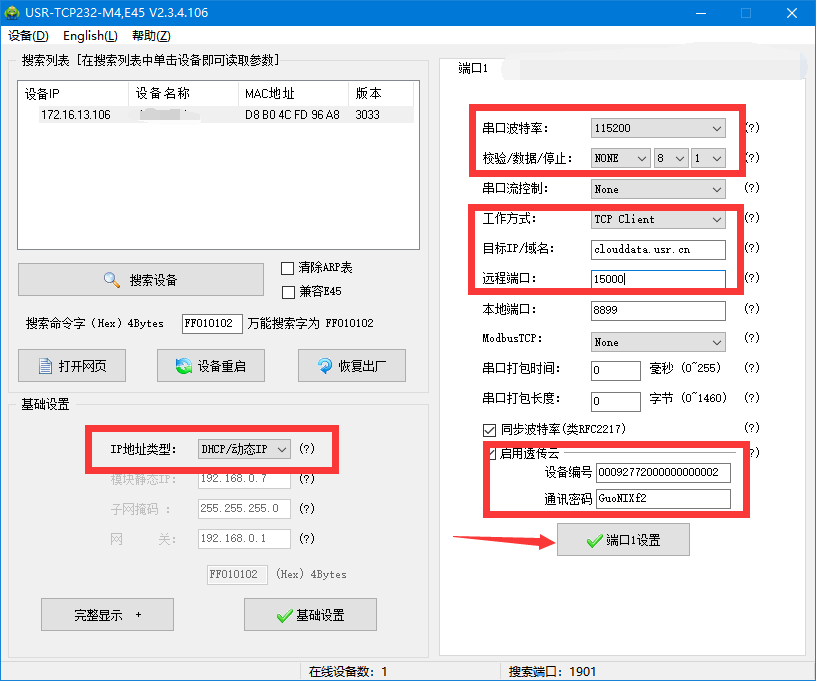 4.設置參數:將工作方式 ,遠程服務器地址和遠程端口分別設置為:TCp client、clouddata.usr.cn、15000;