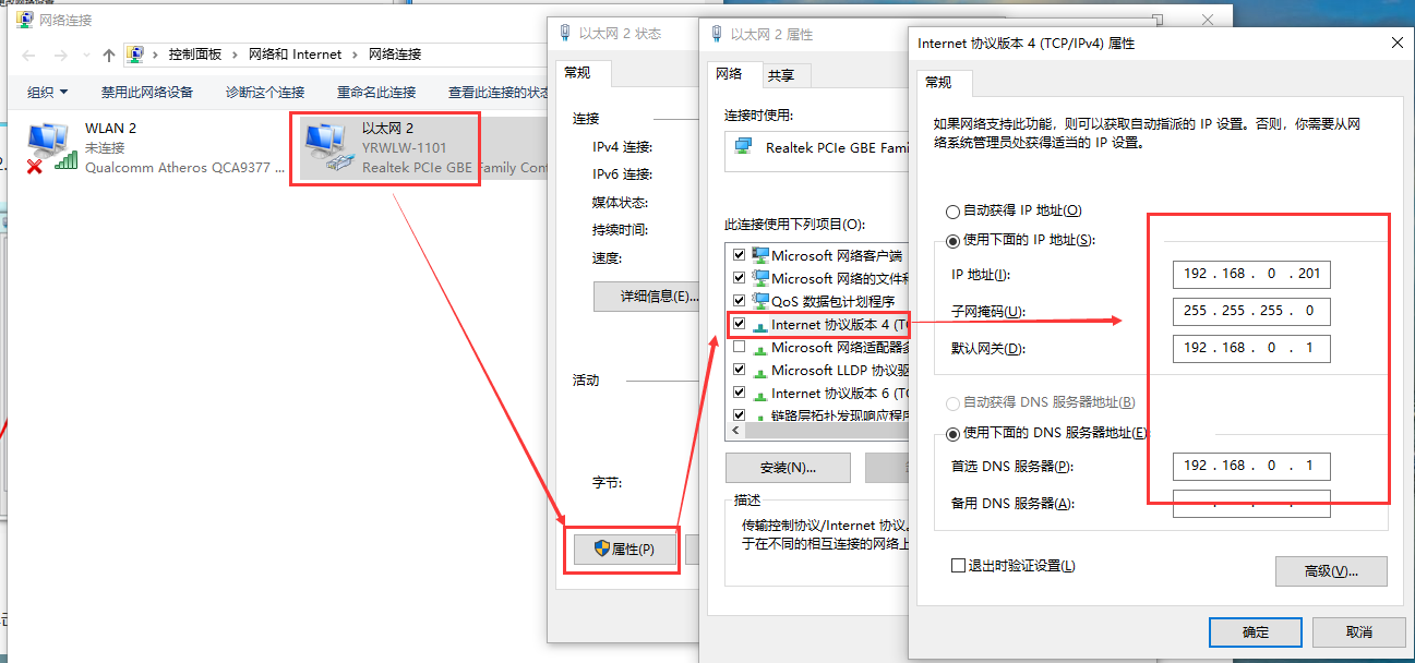 3、給電腦設(shè)置靜態(tài)IP,設(shè)置成302默認(rèn)目標(biāo)IP:192.168.0.201 。