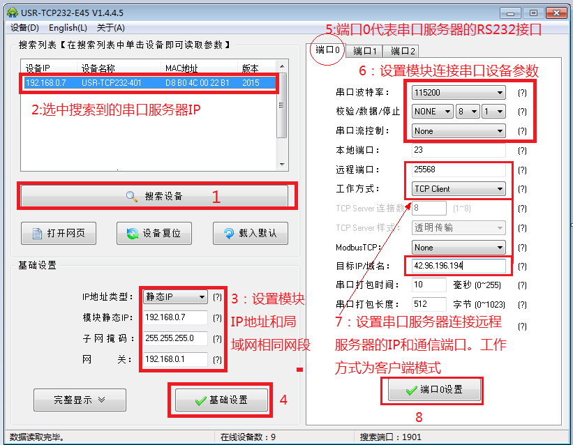 我們采用USR-TCP232-401模塊為例,連接可以聯(lián)網(wǎng)的路由器,電腦連接和模塊相同的路由器。打開(kāi)設(shè)置軟件USR-TCP232-E45_Setup_V。詳細(xì)設(shè)置按照以下步驟。
