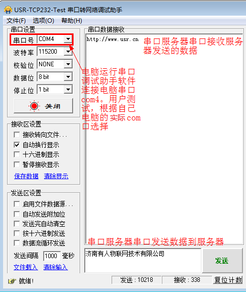 以上是服務(wù)器發(fā)送數(shù)據(jù)和接收數(shù)據(jù):以下使用電腦串口連接串口服務(wù)器串口,電腦運(yùn)行串口調(diào)試軟件,進(jìn)行發(fā)送和接收服務(wù)器的數(shù)據(jù)。