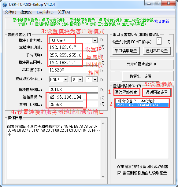 4:USR-TCP232-T24系列模塊也可以連接服務(wù)器,具體設(shè)置參數(shù)如下。