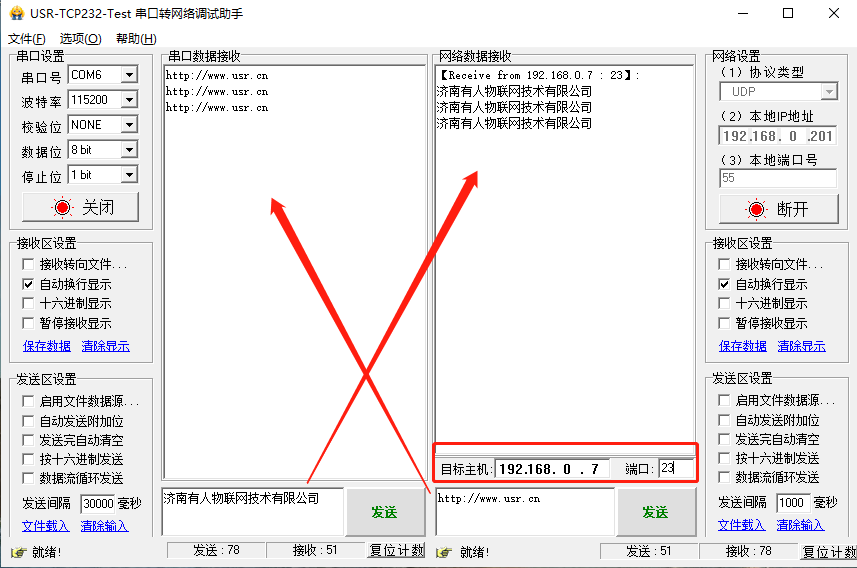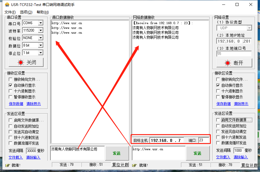 點擊“連接”后,需要將目標主機和端口改為301的Ip和本地端口,然后串口往網絡發一包數據建立連接后,網絡即可往串口發數據。