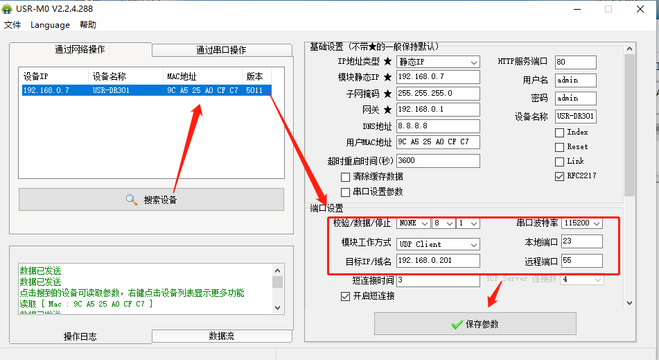 網絡端協議類型選擇UDp,本地Ip:192.168.0.201,本地端口號:55(可設)。