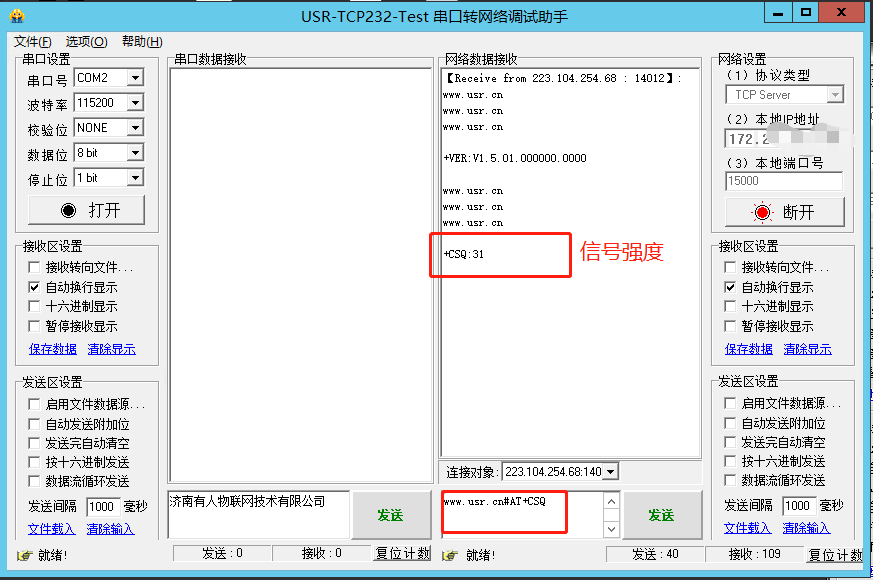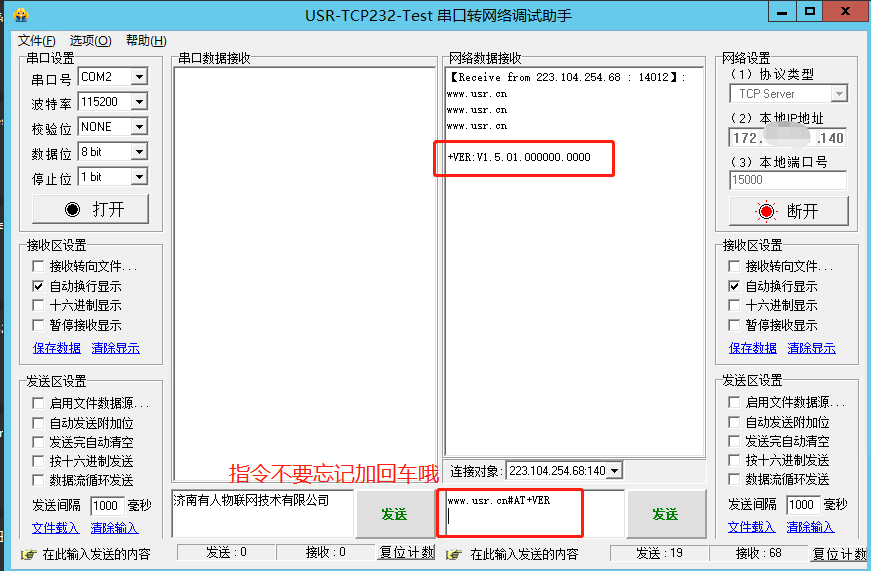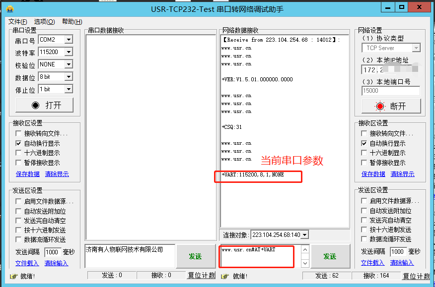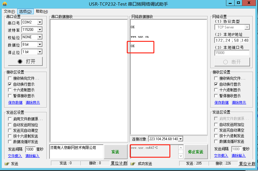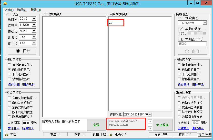 4、連接成功后,可以從服務(wù)器端發(fā)送網(wǎng)絡(luò)AT指令來查詢/設(shè)置DTU的參數(shù)