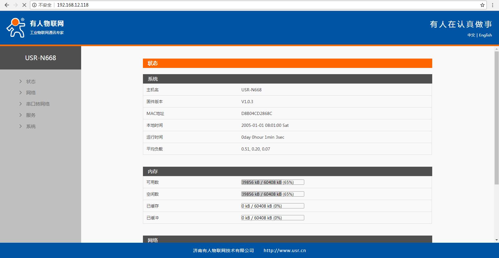 在瀏覽器輸入N668的IP,可以登錄N668的內置網頁。設置串口一參數工作方式TCP server 本地端口20001 開啟MODBUS TCP功能。網頁設置參數完成之后,重啟N668。