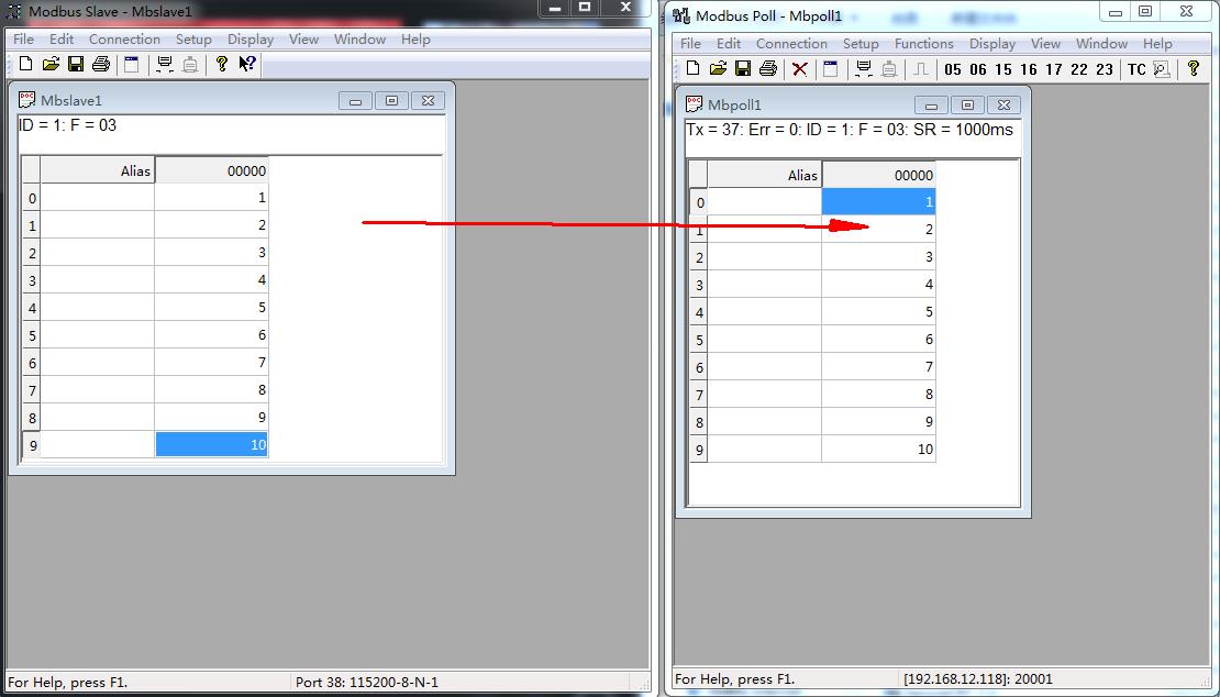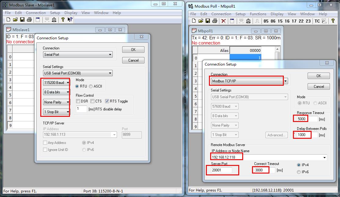 在電腦下載,并安裝打開MODBUS SLAVE和MODBUS POLL 軟件。軟件建立TCP連接,USB-RS232串口線接N668串口一和電腦,改變MODBUS SAVLE從機寄存器地址數據,對應MODBUS POLL 寄存器地址數據改變,就可以實現N668串口和網絡之間數據傳輸。