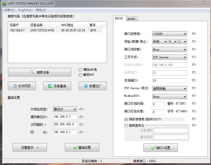 用M4設(shè)置軟件搜索USR-TCP232-410S的IP,192.168.0.7,USR-TCP232-410S用串口設(shè)置軟件設(shè)置DHCP,動態(tài)獲取IP。