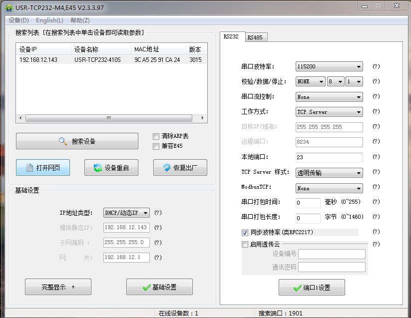 410S網(wǎng)口用網(wǎng)線接路由器,電腦也連接同一個路由器。用M4設(shè)置軟件搜索USR-TCP232-410S的IP 192.168.12.143