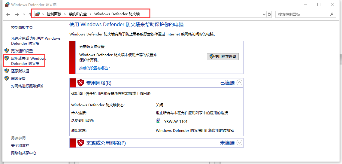 1. 按路徑:控制面板》網絡和Internet》網絡和共享中心找到“windows防火墻”和“更改適配器設置”選項,關閉防火墻并禁用與本次測試無關的網卡。并關閉電腦殺毒軟件。