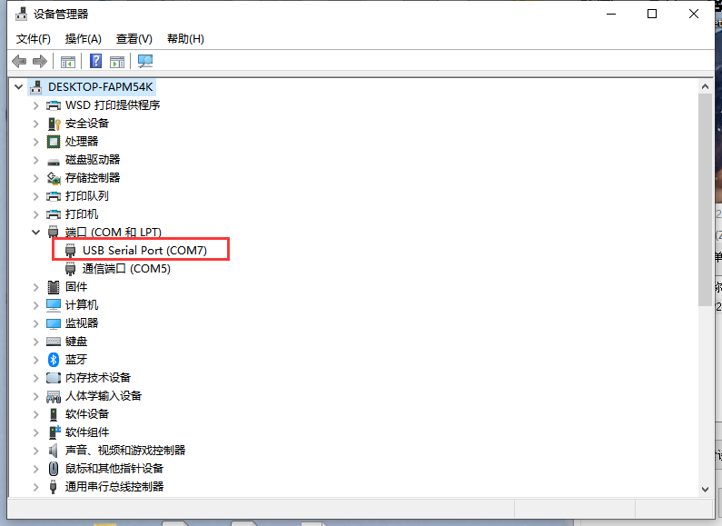3. 在設備管理器中查看端口信息,確定E2串口使用的串口號,如下圖所示電腦端口號為COM7,如果沒有看的COM口,下載一個驅動精靈修復一下。