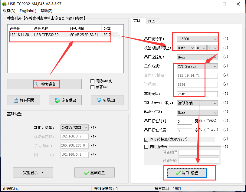 點擊“搜索設備”當搜索列表中出現E2的設備后,單擊搜索到的設備,查看其配置信息,工作方式選擇TCp server,本地端口號:2342,點擊端口設置保存參數。