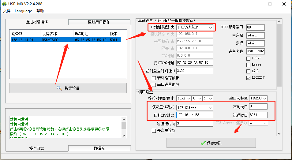 點擊“搜索設(shè)備”當搜索列表中出現(xiàn)302的設(shè)備后,單擊搜索到的設(shè)備,右邊基礎(chǔ)設(shè)置,在“Ip地址類型”將靜態(tài)Ip改為DHCp動態(tài)獲取,點擊保存參數(shù)。