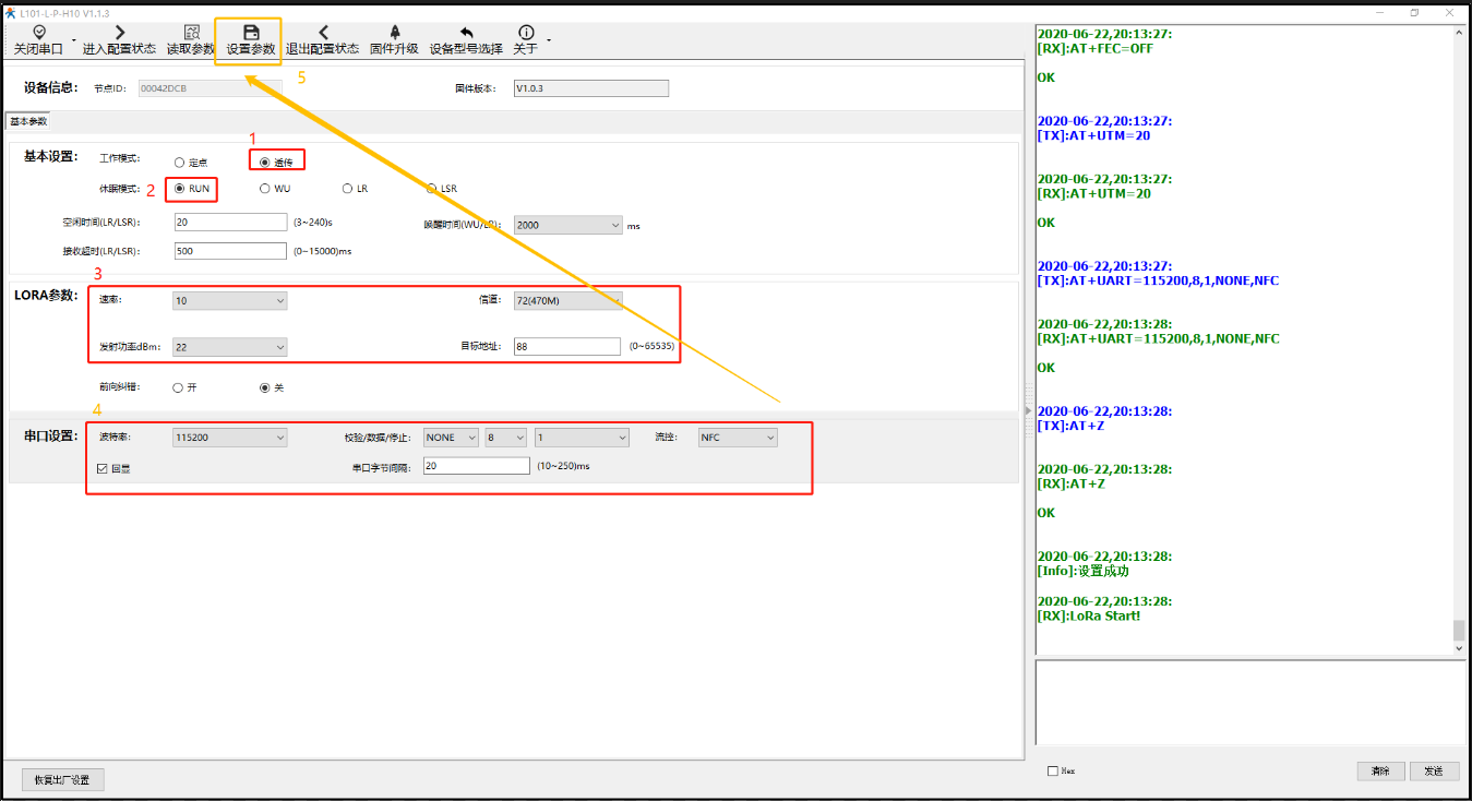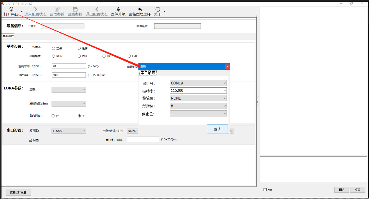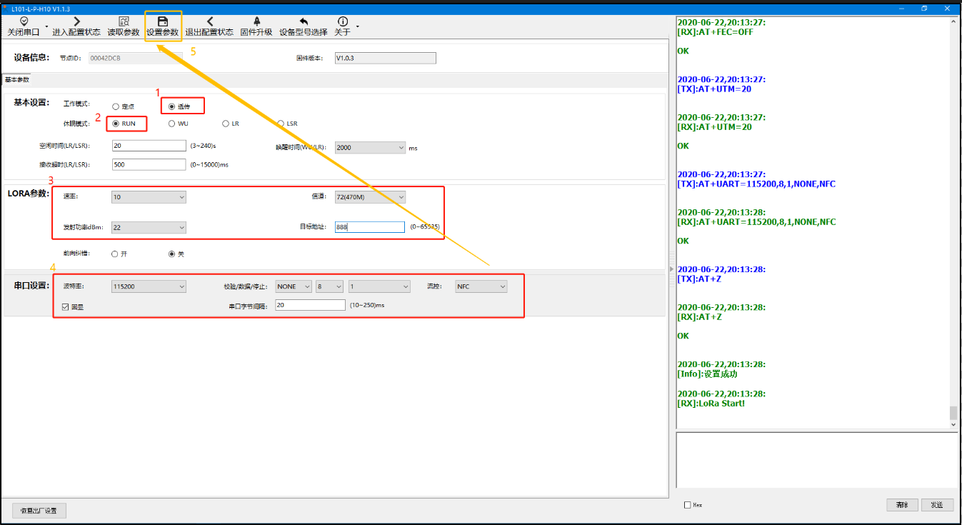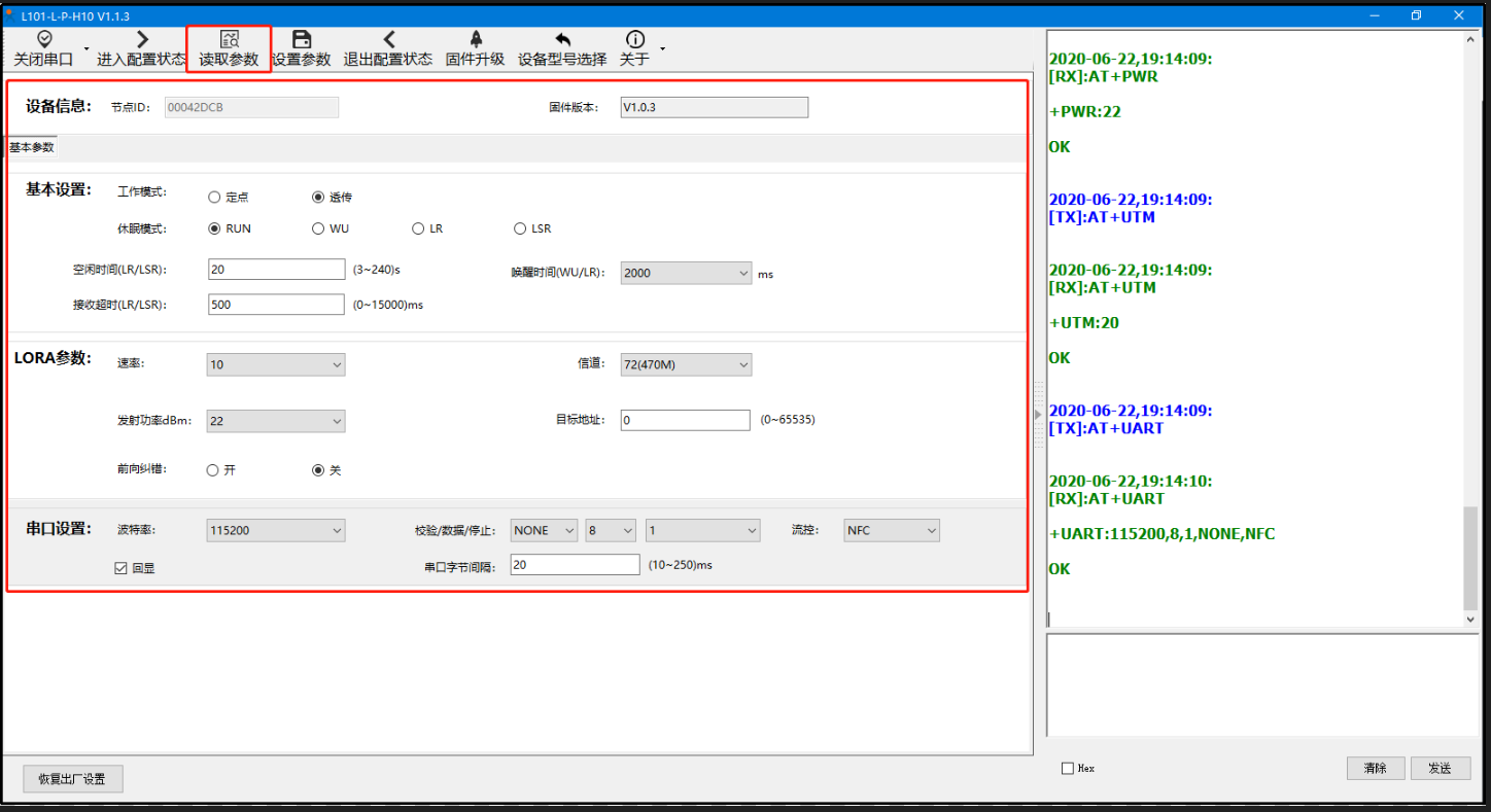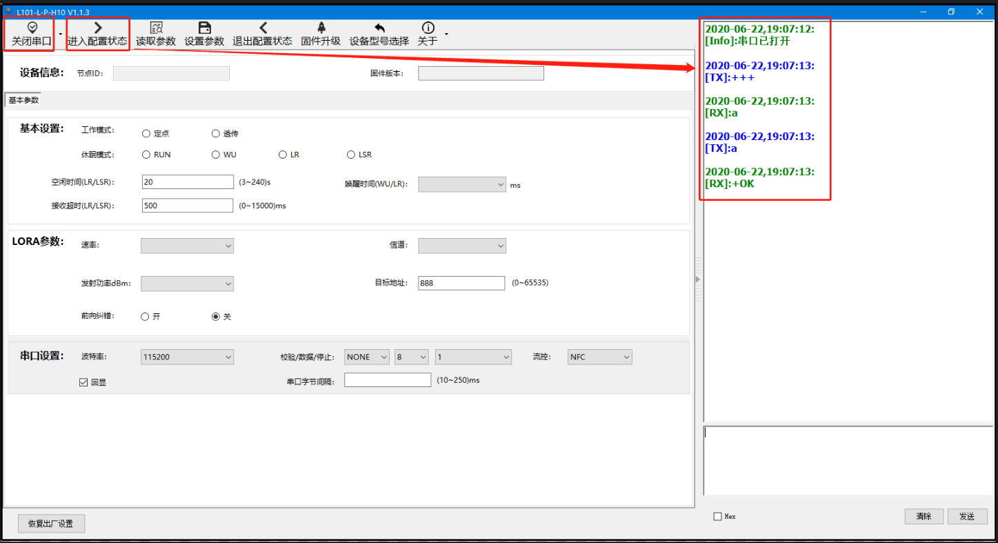 A、打開LoRa設置軟件(產品型號選擇為L101-L-p-H10),依次點擊打開串口(選擇A、B對應的串口號,串口參數:115200,None,8,1,NFC)、進入配置狀態、讀取參數、配置上表中的參數、一鍵設置所有參數,關閉LoRa設置軟件。
