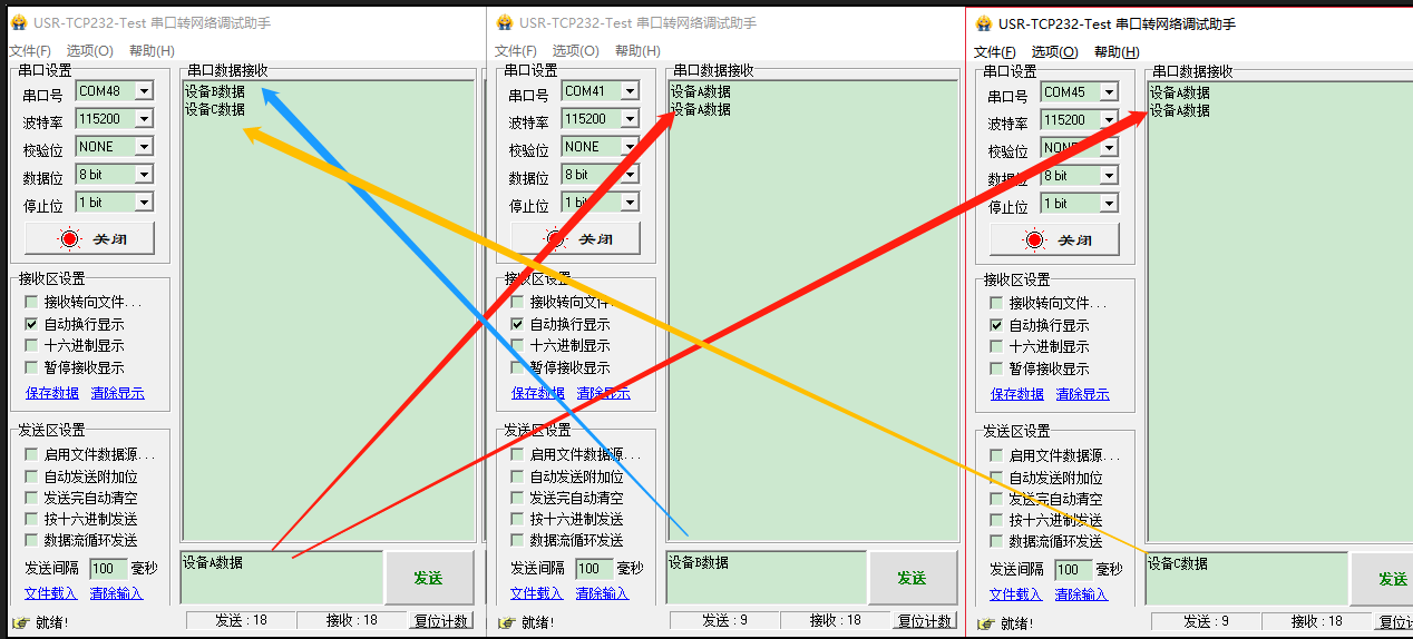 啟動三個USR-TCp232-Test(模擬串口設備1,2,3)分別連接LoRa數傳廣播端A、接收端B、C的串口,使用串口設備1發送數據,串口設備2、3可接收數據,設備2、3的數據可以發送給設備1,通信效果如下圖所示: