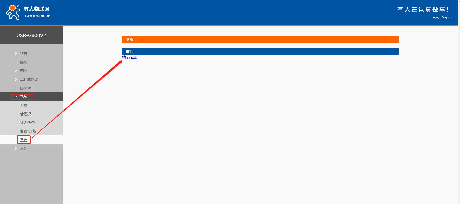 5、設置完成后,內置網頁中選擇系統---重啟界面,執行重啟。重啟后設置的參數才能生效。