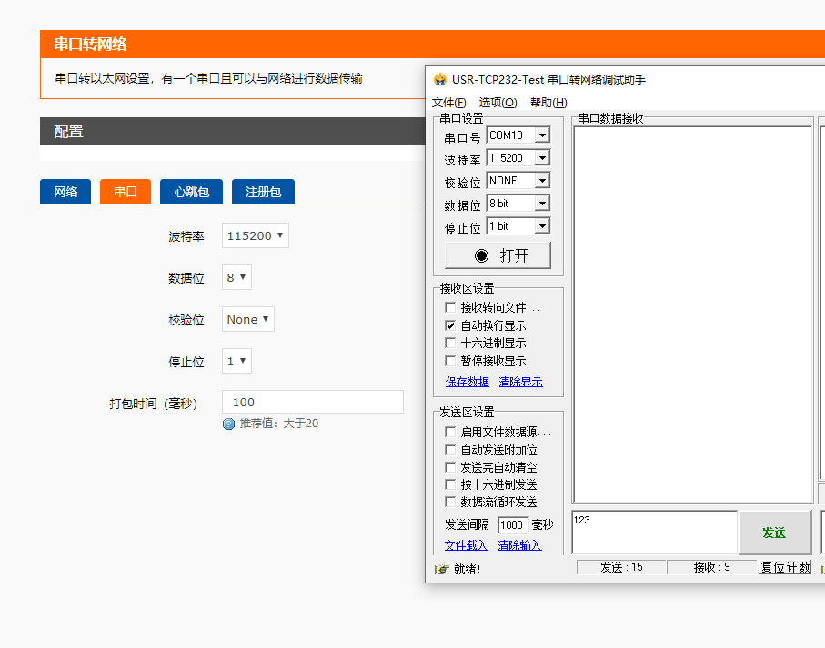 5、等到設備重啟完成,再次進入內置網頁看一下參數是否保存。串口調試助手打開800V2相應的串口,串口參數一致。