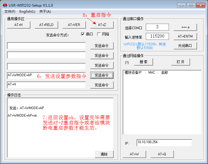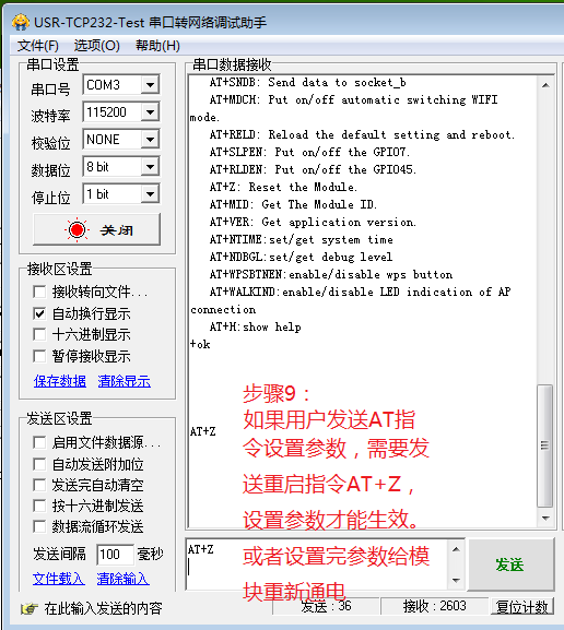 2.3:如果發(fā)送AT指令設(shè)置參數(shù),設(shè)置之后,發(fā)送AT+Z重啟指令重啟生效。