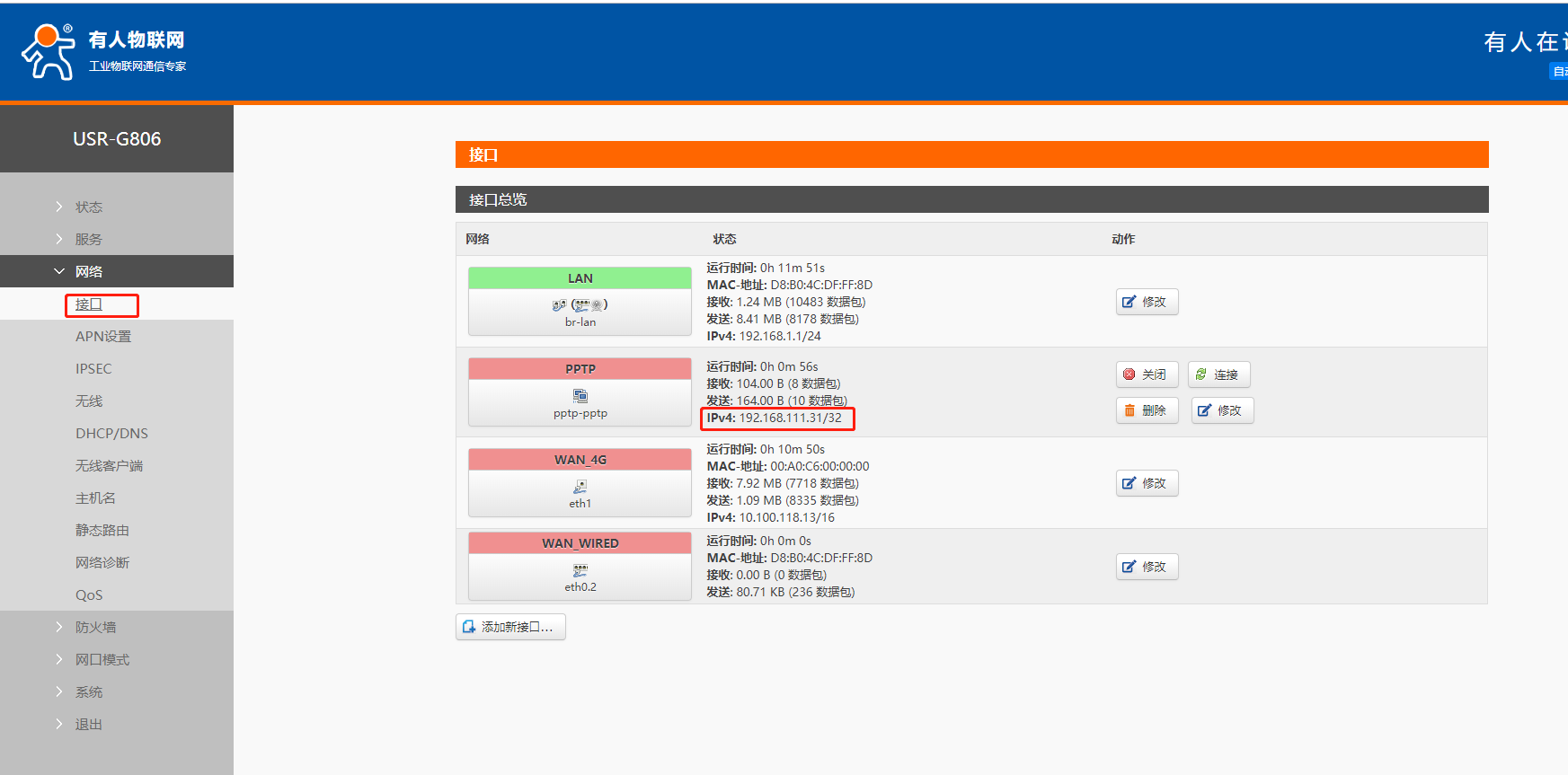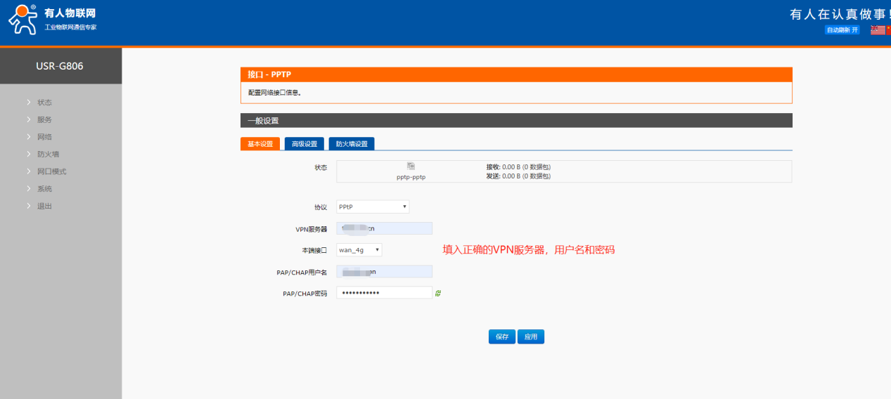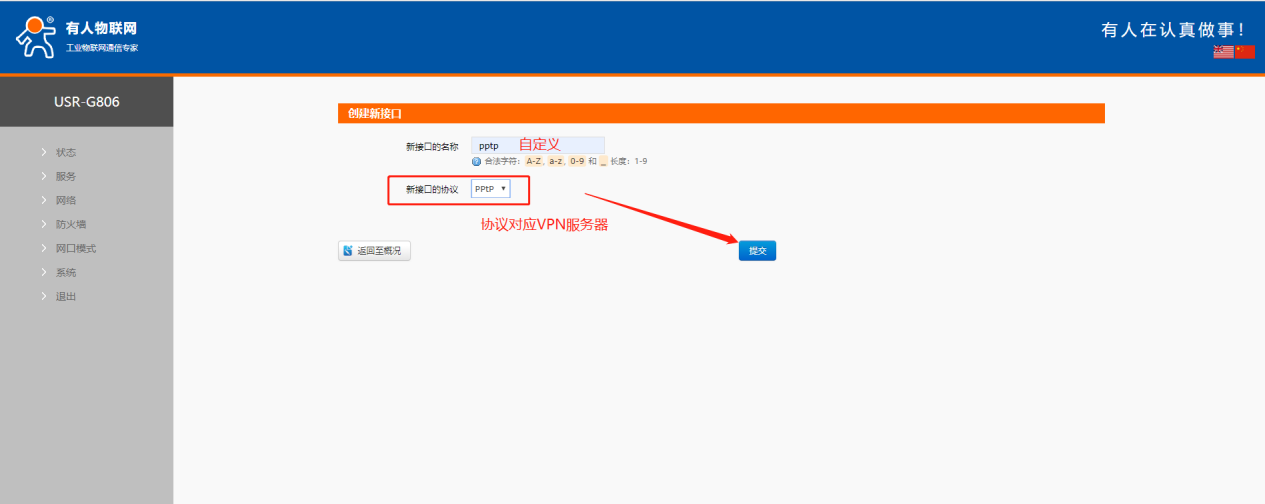 USR-G806:采用 4G 接口連接外網,創建 PPTP 接口連接 VPN;