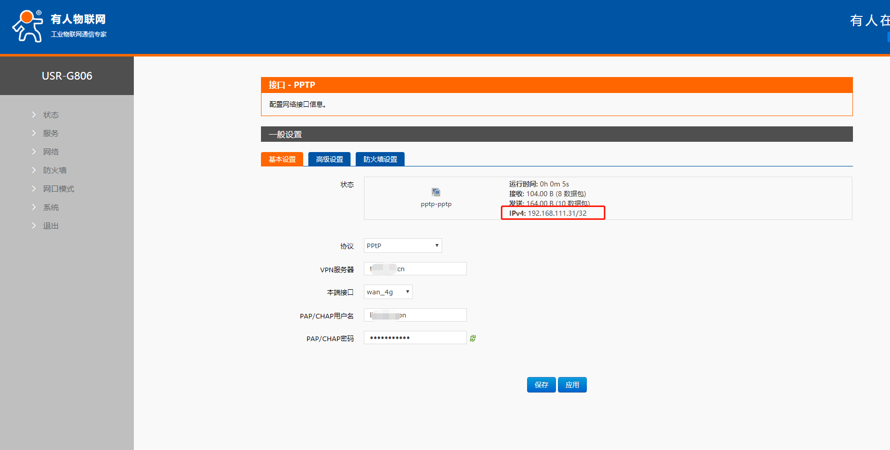 6. 設置參數無誤,保存應用之后可以看到設備獲取到的VPN IP。在接口pptp位置可以看到,也可以進入pptp這個接口查看。