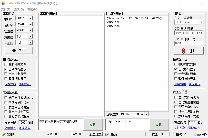 8、PC2也就是806的內網電腦打開一個串口調試助手,做tcp server,IP和端口為本身的IP和端口,開始監聽。