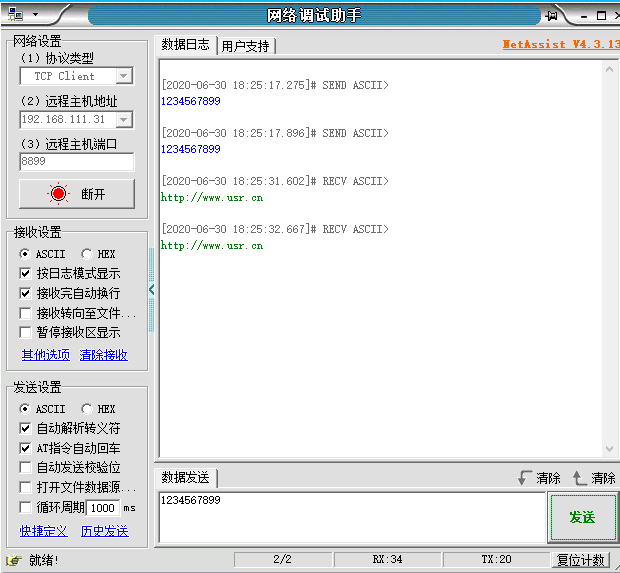 9、PC1即另一臺直接連上VPN的電腦,打開網絡調試助手,做tcp clinet端,IP設置806獲取到的VPN IP,端口設置為端口轉發的外部端口。能夠連接到 4G 路由器下的 TCP Server 并進行通信。