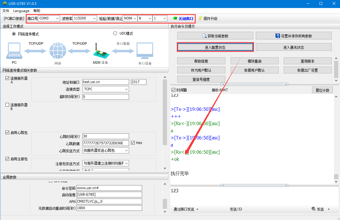 1>DTU出廠默認的串口參數是115200,n,8,1;確定打開串口的參數沒有問題