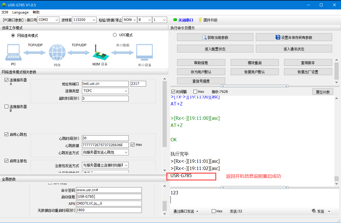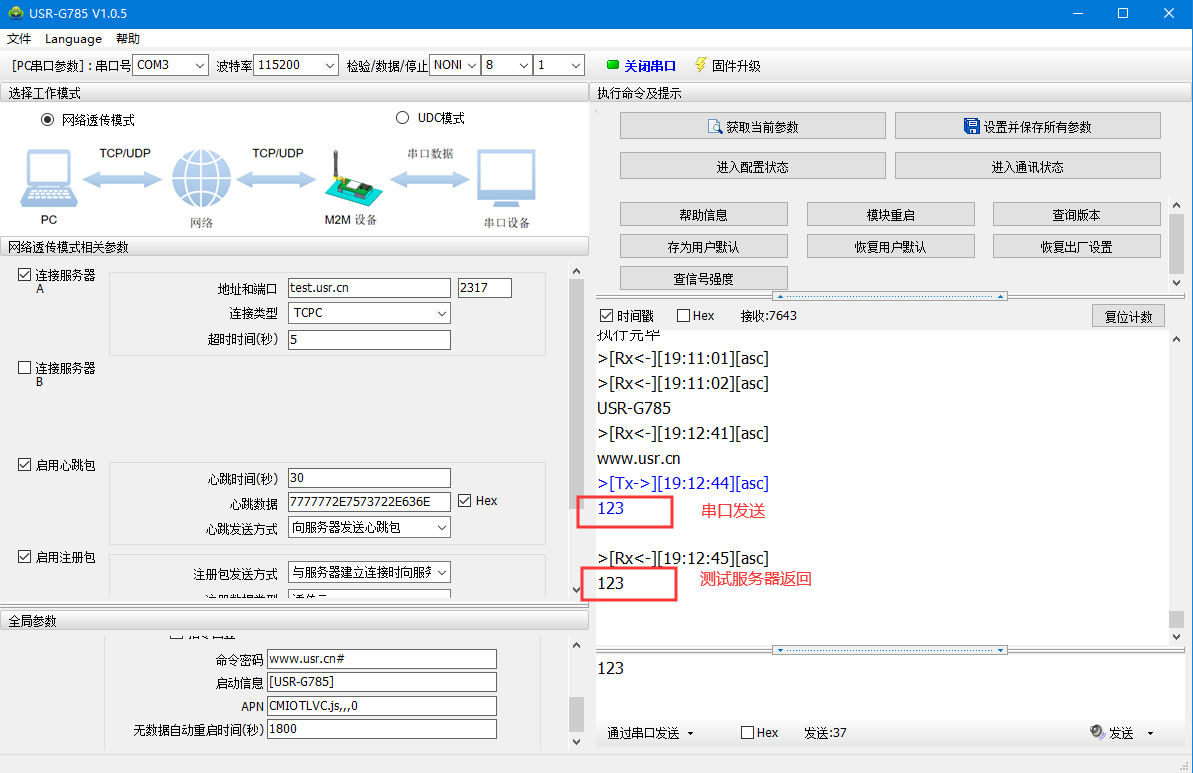 通過串口發送<123>,可以看到服務器返回了相同的內容,說明DTU工作是沒有問題的