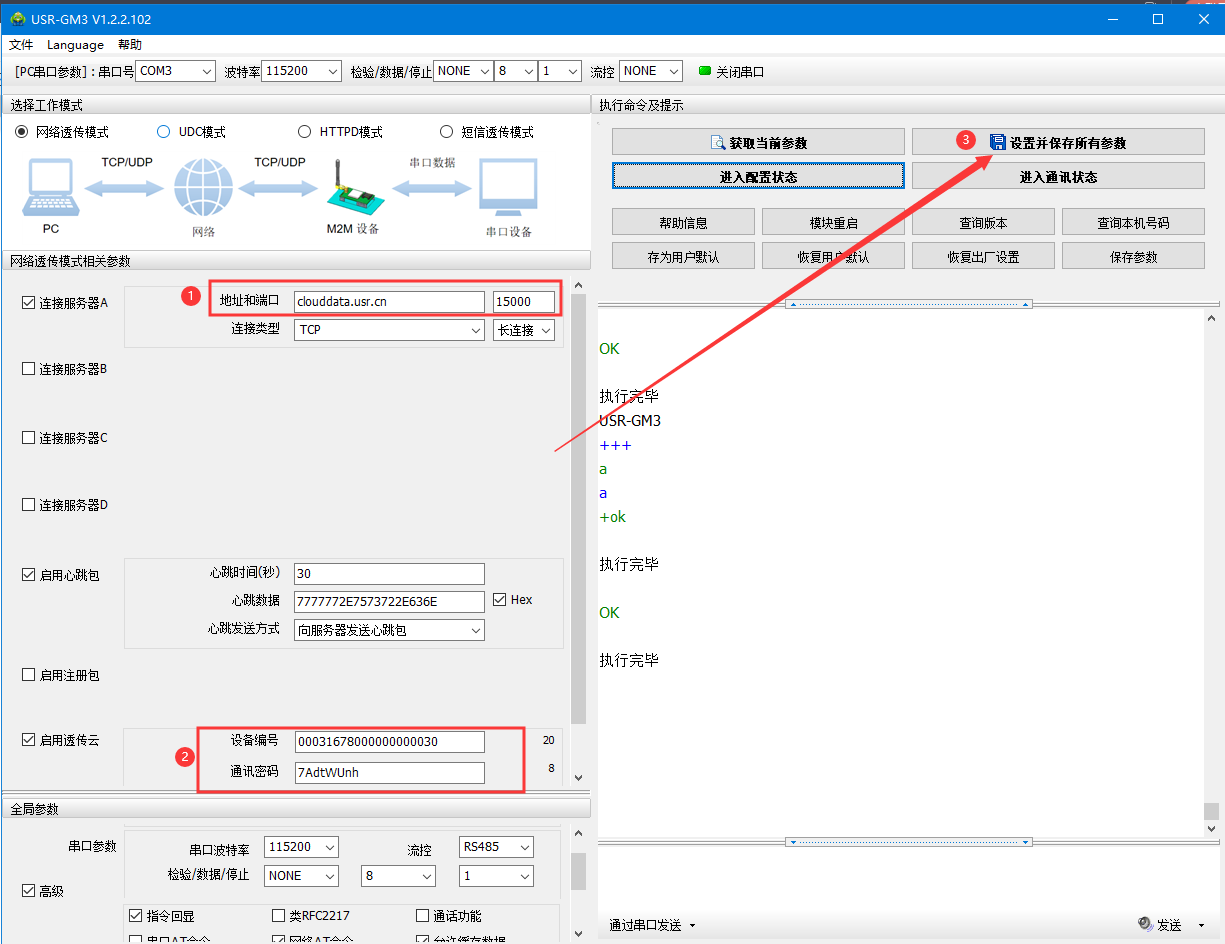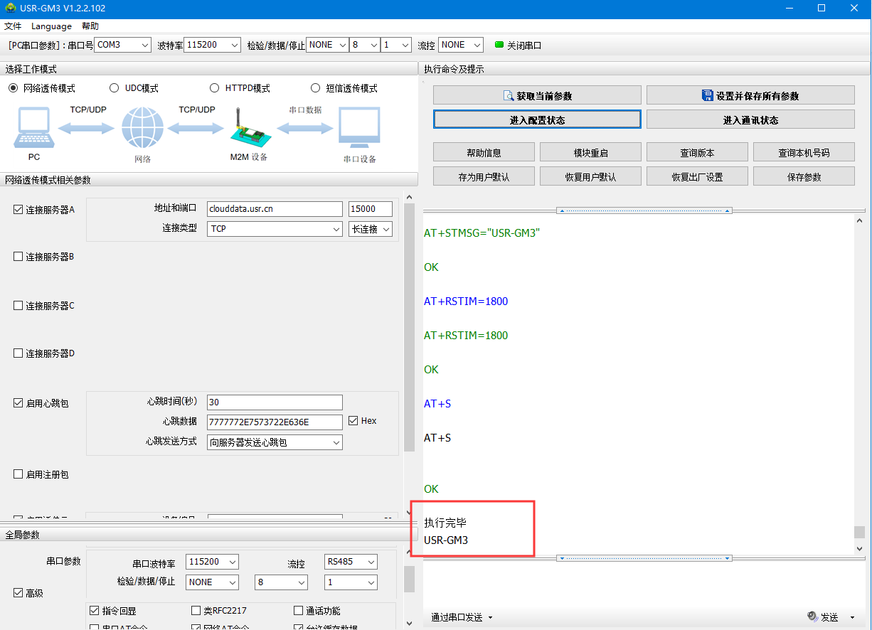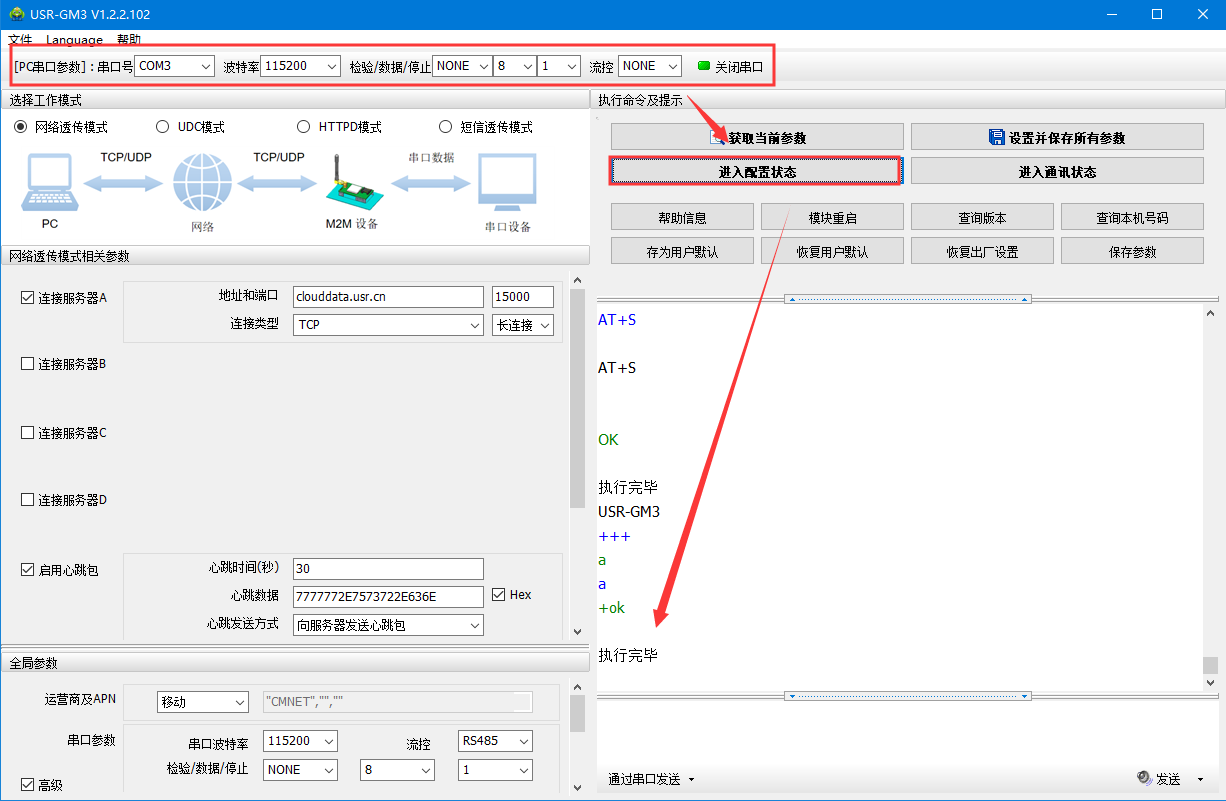 (2)默認串口參數115200 N 8 1,打開串口——進入配置狀態——返回OK說明進入配置狀態成功