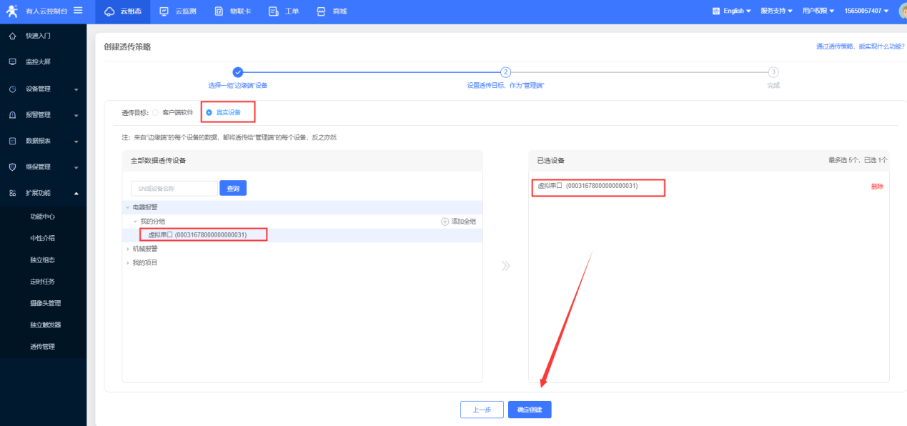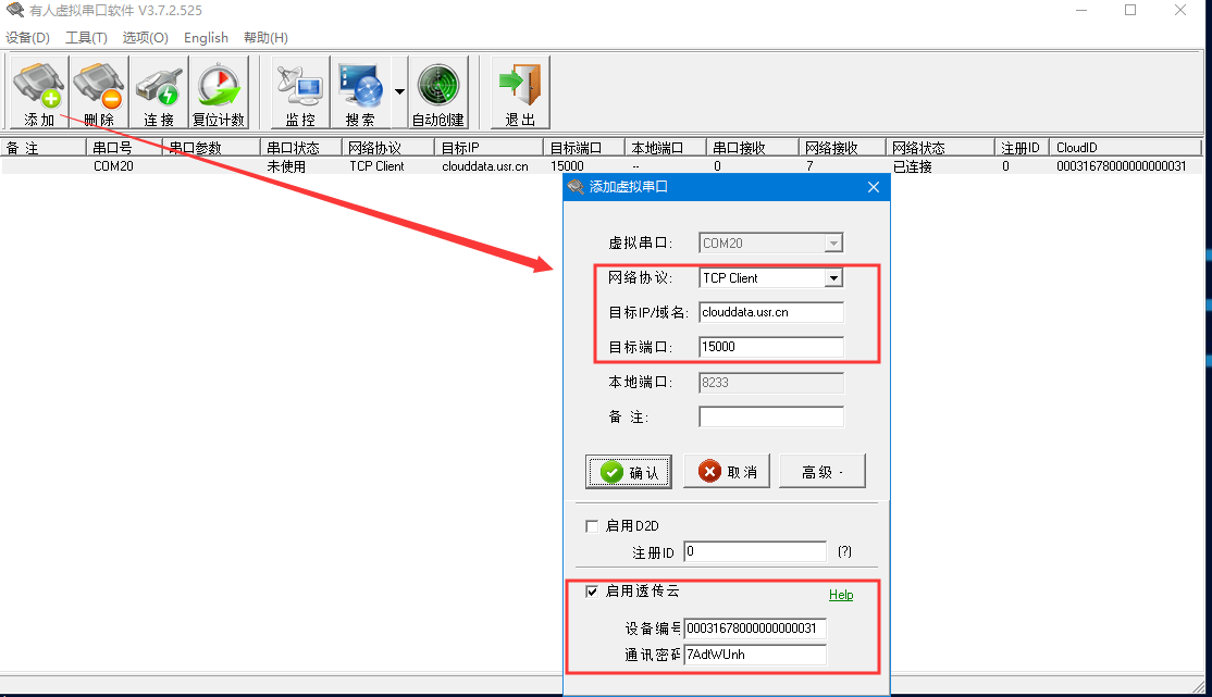 點擊添加——選擇虛擬串口號——網絡協議tcp client ——目標IP/域名clouddata.usr.cn——端口15000——啟用透傳云——將云端生成的虛擬串口的設備編號和通訊密碼復制到參數區,點擊確認;可以看到虛擬串口在有人云上線