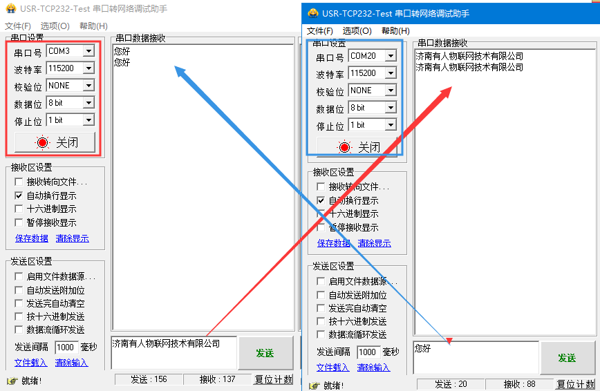 打開兩個USR-TCP232-TEST網絡助手,左側串口部分用COM3和虛擬串口COM20打開,串口參數和734設置一致。