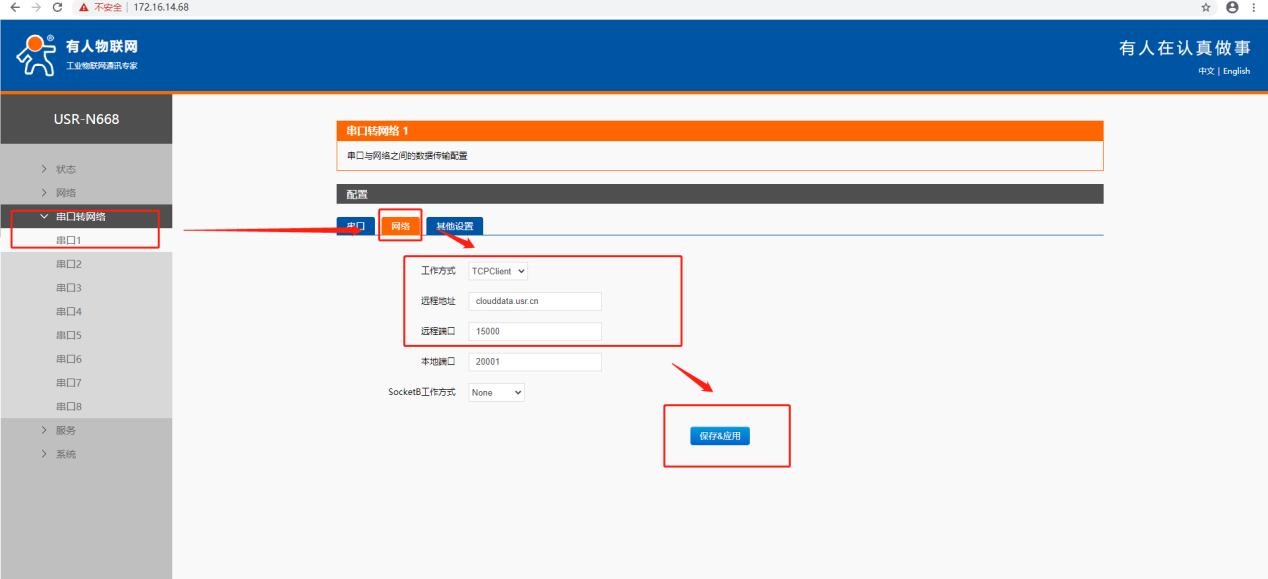 7. 設置端口1的參數(shù),工作方式選擇TCP Client,遠程服務器地址:clouddata.usr.cn,遠程端口:15000,本地端口不要設置為0,默認即可。