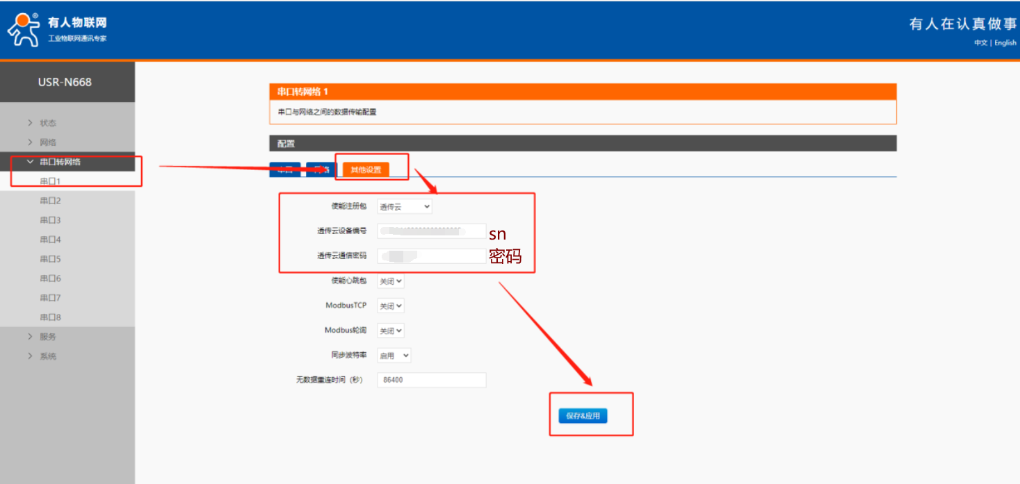 8.注冊包類型選擇透傳云,設備編號和密碼填寫為在云端添加設備生成的設備編號和密碼(SN與密碼可以通過操作按照圖示下面的案例獲取)(圖片中的為測試生成的,請?zhí)顚懽约旱脑O備編號和密碼)設置完成后點擊保存應用。