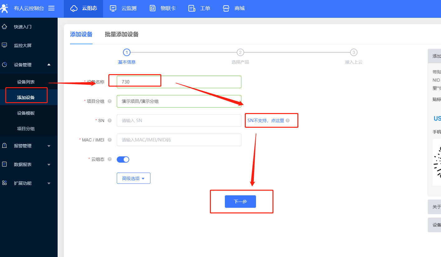(2) 730目前不支持SN碼添加,點擊右側“SN不支持,點這里”,設備ID和通訊密碼可以自動生成,設備ID20位,通訊密碼必須是8位(支持修改密碼)。