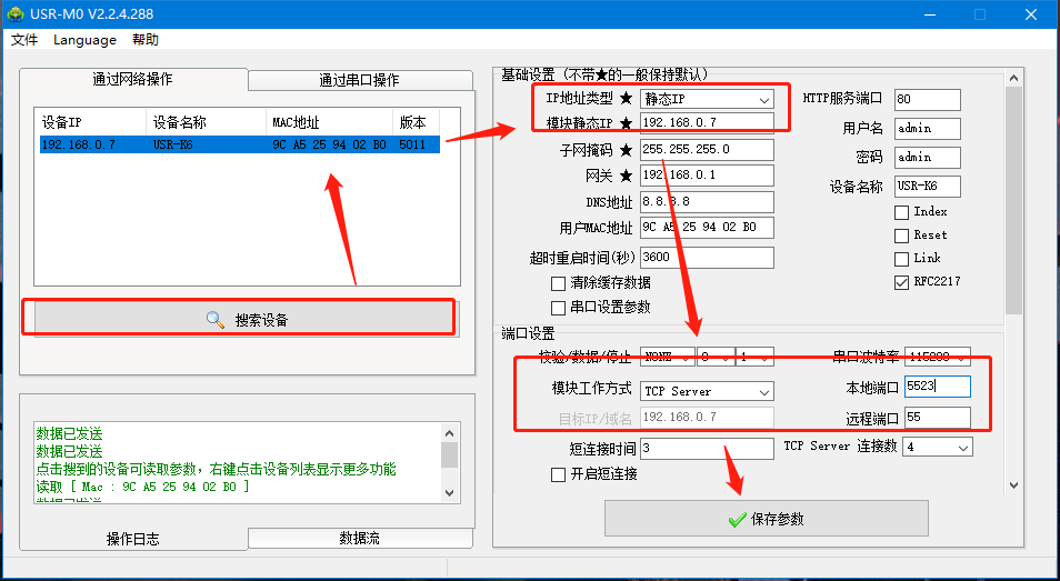 4、打開設置軟件,點擊“搜索設備”當搜索列表中出現K6的設備后,點擊搜索到的設備,模塊工作方式設為TCP SERVER,本地端口5523,點擊保存參數。
