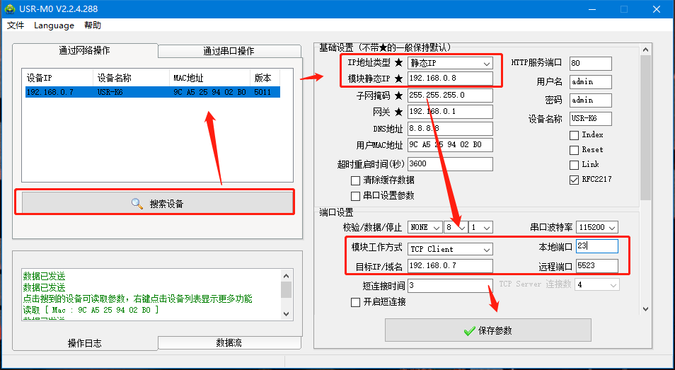 5、點擊“搜索設備”當搜索列表中出現另一臺K6的設備后,點擊搜索到的設備,為了防止IP沖突,將此設備IP修改為192.168.0.8,模塊工作方式設為TCP Client,本地端口0,遠程端口5523,點擊保存參數。