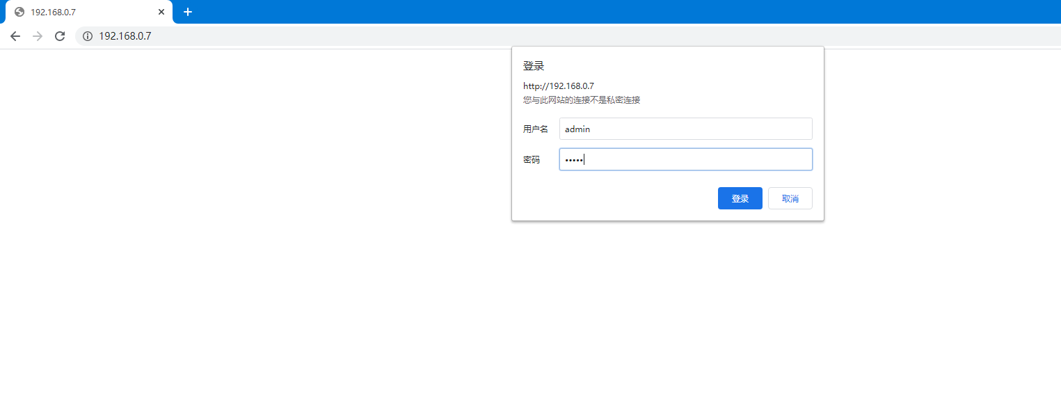 4、打開瀏覽器,進入668的內置網頁,默認IP為:192.168.0.7,用戶名和密碼均為admin。(進不去內置網頁:清除瀏覽器所有緩存,更換其他瀏覽器進行嘗試)