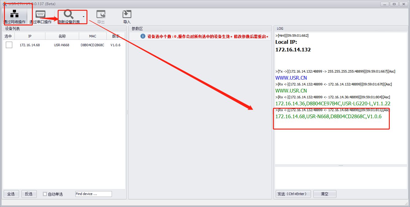6、N668網線直連路由器,電腦設置為DHCP網線直連路由器,打開668設置軟件,通過網絡搜索,刷新設備列表,可以確認668此時的IP為:172.16.14.68。668的IP也可以在路由器內置網頁確認。