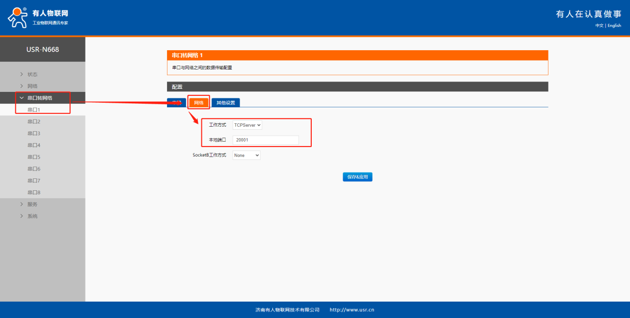 7、用路由器已分配的IP進入668內置網頁,串口轉網絡確認確認串口參數是115200,N,8,1。