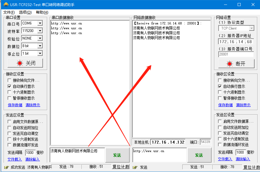 10、在串口和網絡之間進行數據收發測試,串口到網絡的數據流向是:PC串口->668串口->668以太網口->PC網絡;網絡到串口的數據流向是:PC網絡->668以太網口->668串口->PC串口。具體演示如下圖所示: