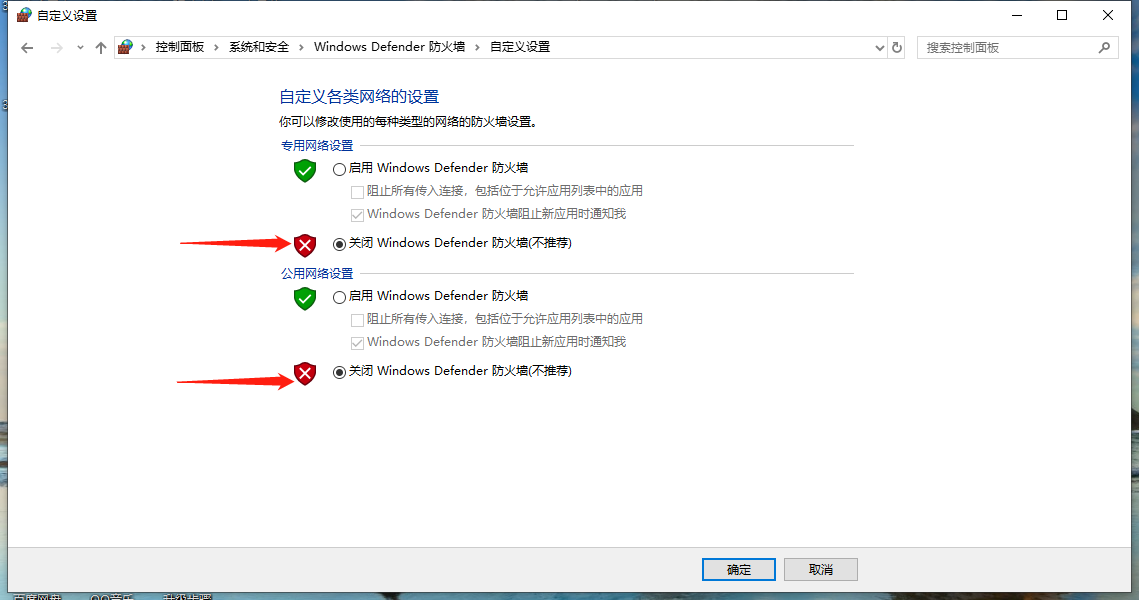 3、按路徑:控制面板找到“windows防火墻”和“更改適配器設置”選項,關閉防火墻并禁用與本次測試無關的網卡。并關閉電腦殺毒軟件。