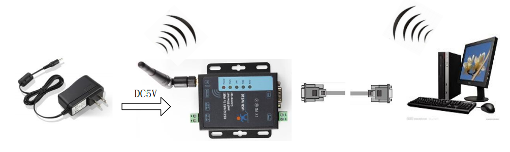 我們將 串口服務(wù)器USR-W610 串口服務(wù)器的串口與計算機的串口連接,串口服務(wù)器的 WIFI 和計算機的 WIFI 連接。臺式機如無自帶串口和 WIFI,可以用 USB 轉(zhuǎn) 232 線和無線網(wǎng)卡 來替代。硬件連接如下圖: