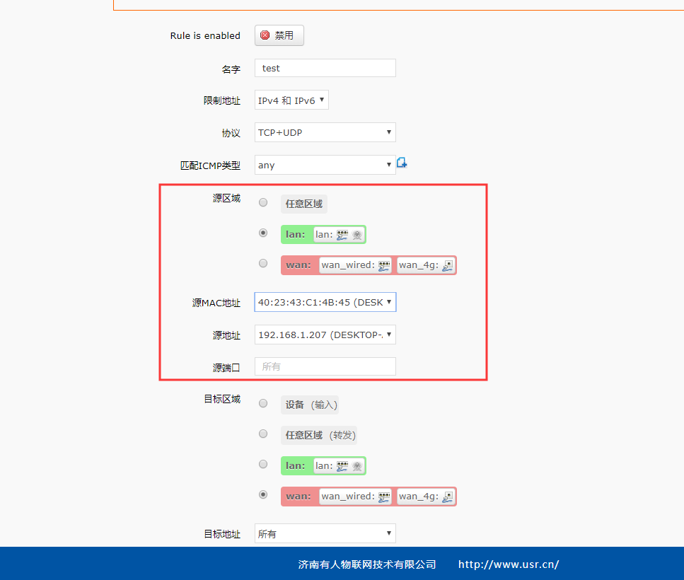 6.在跳轉(zhuǎn)的頁面中,源區(qū)域選擇lan,源 MAC 地址和源地址選擇想要禁用設(shè)備的IP和MAC(如果是想禁用806LAN口下級的所有設(shè)備訪問外網(wǎng),可以選擇全部)。設(shè)置的設(shè)備IP和MAC要保持一致,也就是要是同一個設(shè)備