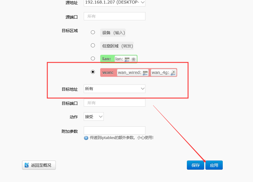 7.在目標區(qū)域選擇 WAN,目標地址填寫禁止訪問的 IP(如果想不訪問所有外網(wǎng)目標地址選擇所有),動作選擇“拒絕”設(shè)置完成后,點擊保存和應用