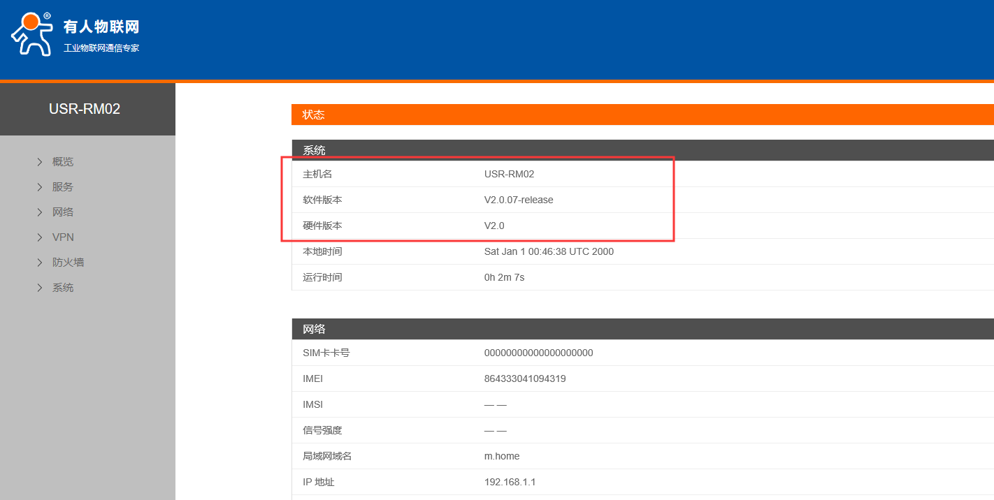 4.在概述--狀態界面可以看到硬件版本V2.0,軟件版本號為2.0.6-release,現在將模塊固件升級為2.0.7-release
